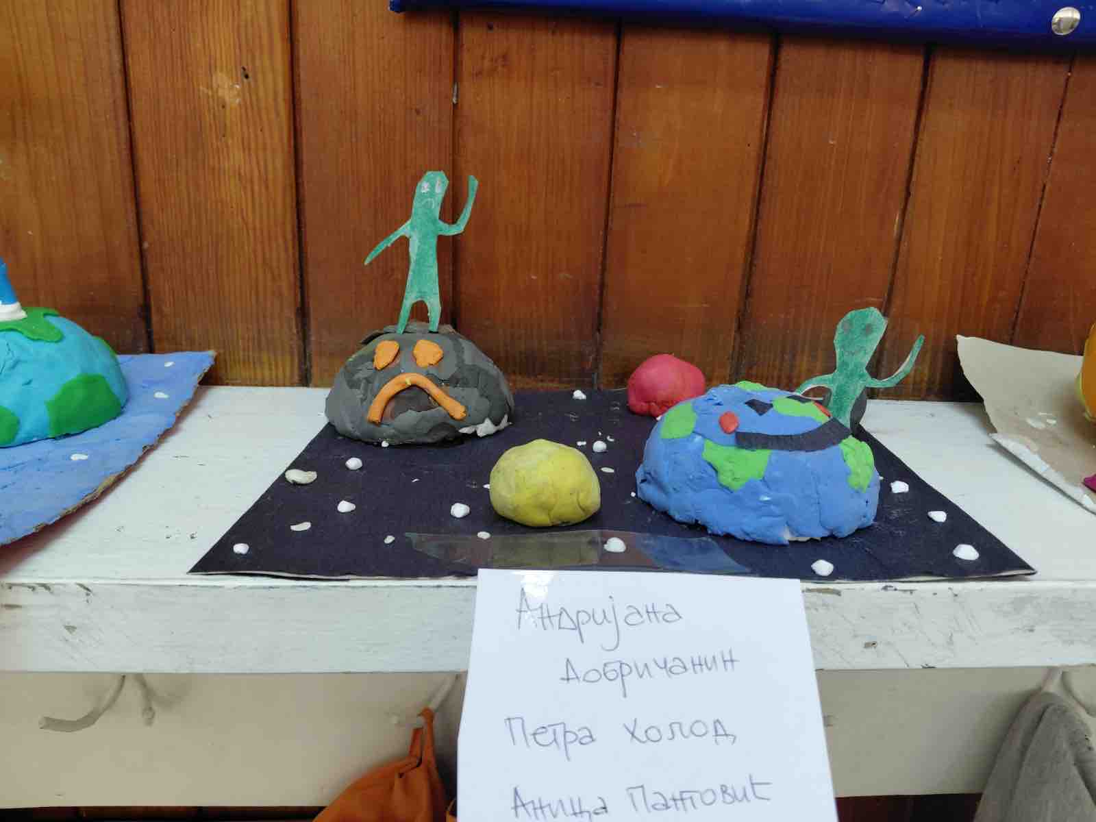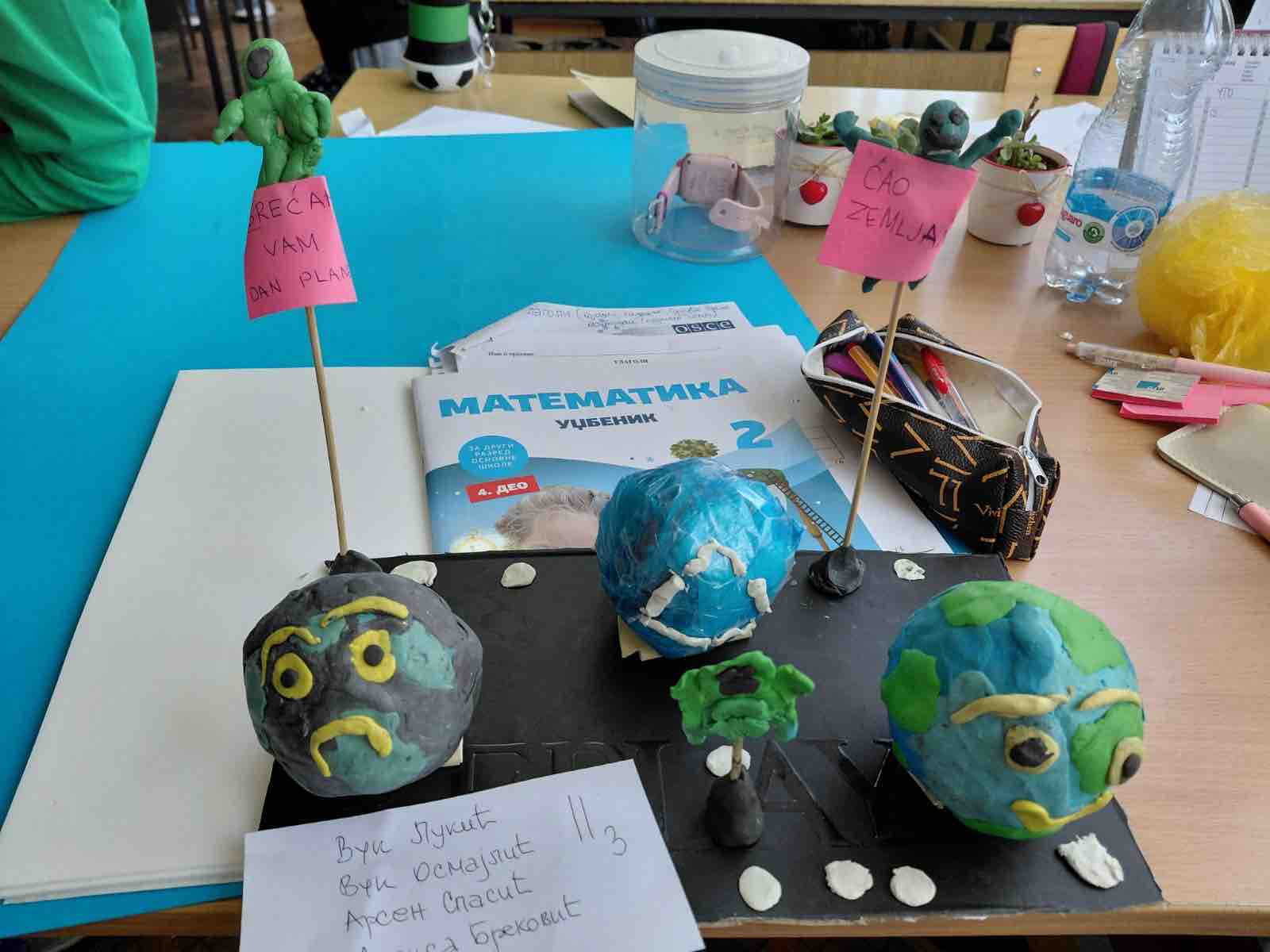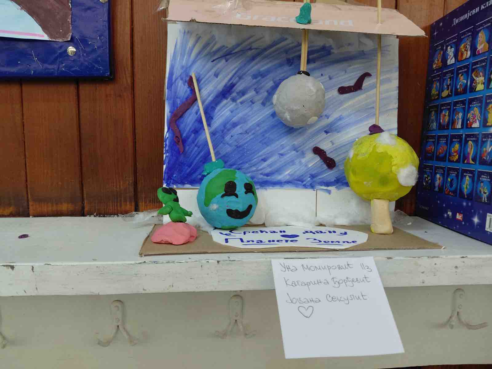 На часу ликовне културе, ученици 2/3 су у оквиру теме Облици у простору, моделовани планету Земљу и остала небеска тела. Групним радом су дочарали своје виђење наше планете и тиме смо обележили њем дан.