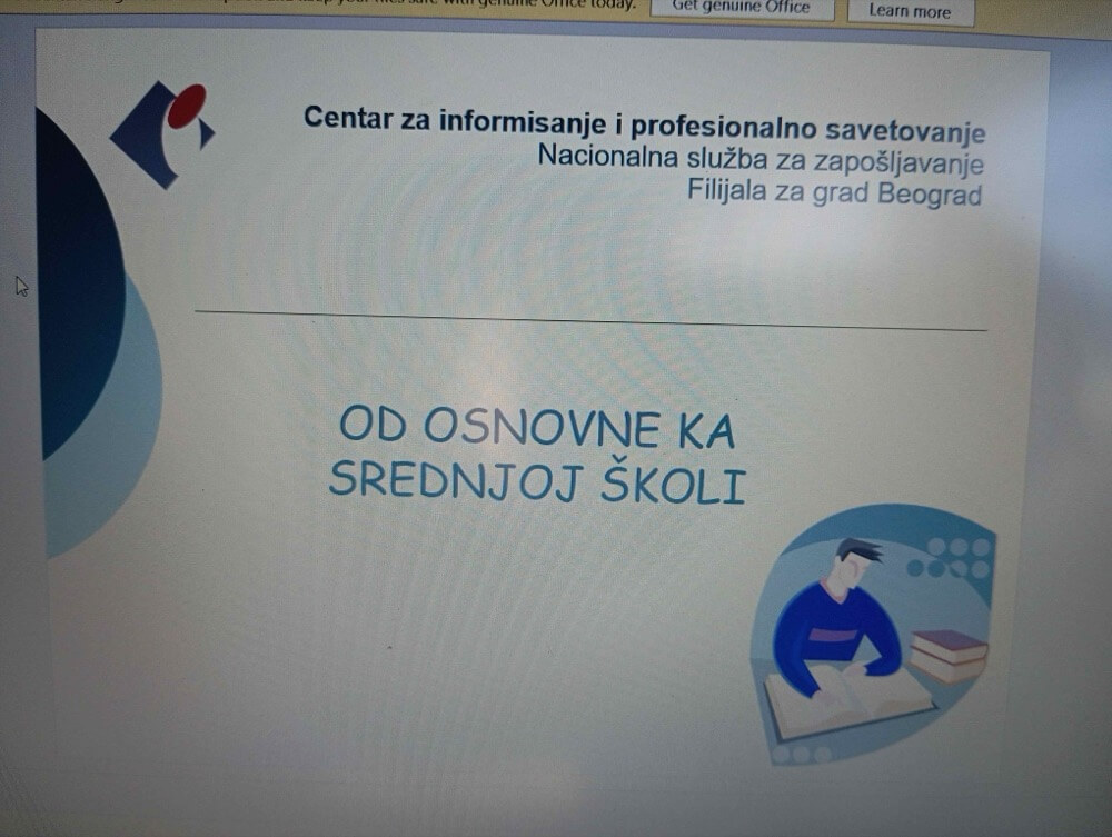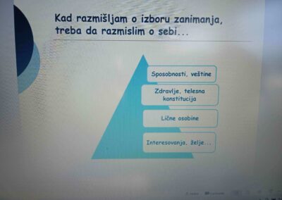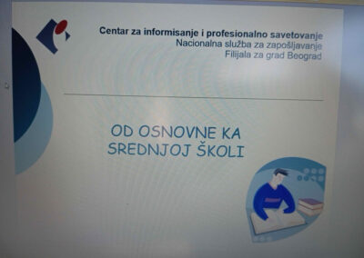 Психолошкиња из Центра за информисање и професионално саветовање је одржала предавања ученицима осмог разреда на тему професионалне оријентације. Разговарали су о важним факторима одабира средње школе и будућег занимања и њиховог међусобног усклађивања – са једне стране способности, особине личности, интересовања и жеље ученика, са друге стране карактеристике и захтеви различитих школа и занимања. Ученици су упознати са принципима рачунања бодова за упис и рангирања, са најчешћим грешкама које се праве при одабиру и упису средње школе, добили су савете за писање листе жеља. Били су заинтересовани за актуелну тему и имали доста питања. На крају, ученици су одрадили тест интересовања и открили који су тип личности.