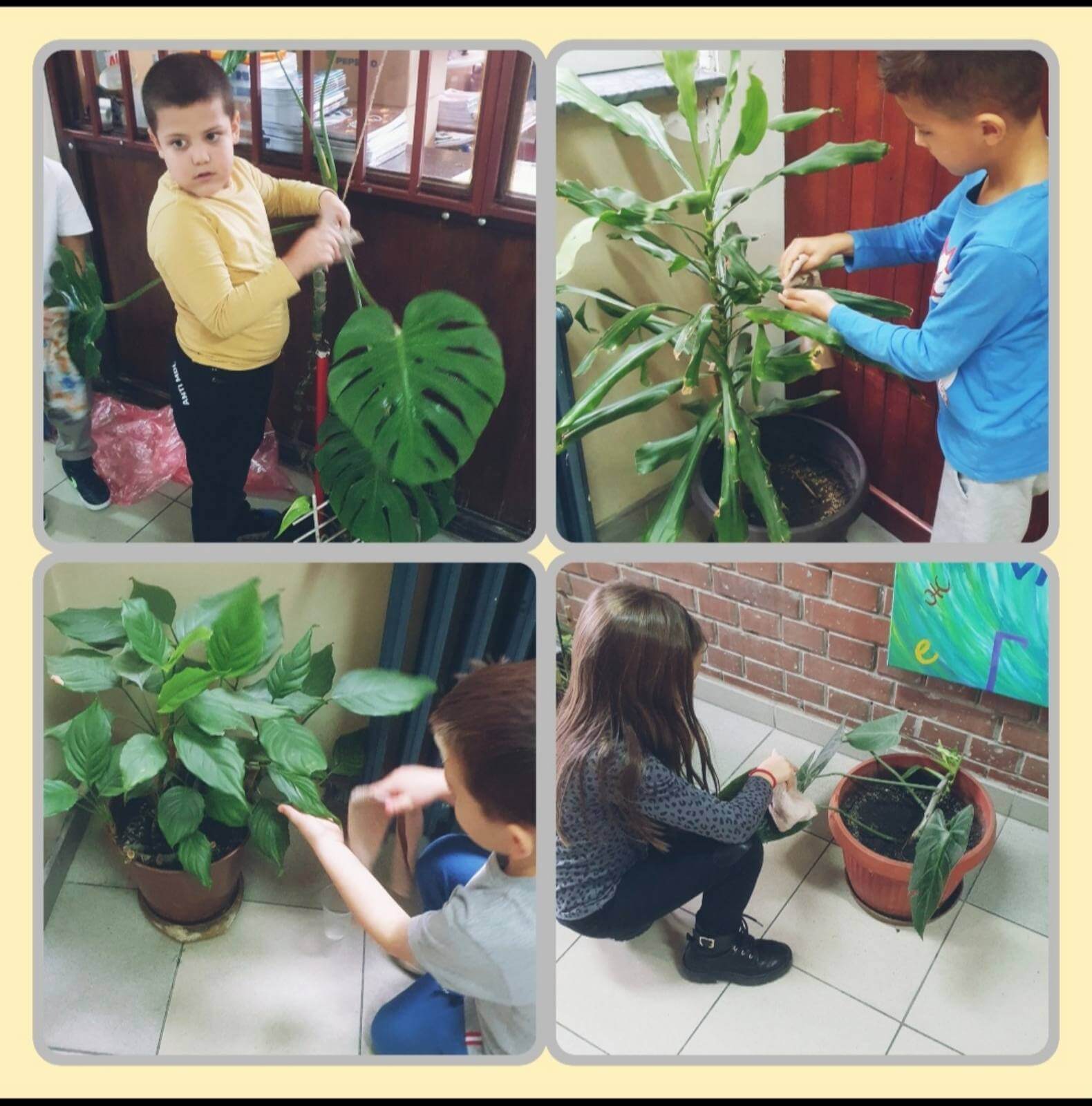 Ученици првог разреда који су укључени у програм еколошке секције, данас су прегледали све биљке које красе нашу школу и чине школску средину здравијом. Сваку биљку су залили и очистили и тиме допронели да оне добију нови сјај. Разговарали смо о значају биљака за нашу средину и направили план да на пролеће оплеменимо нашу школу са још неком биљком