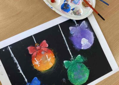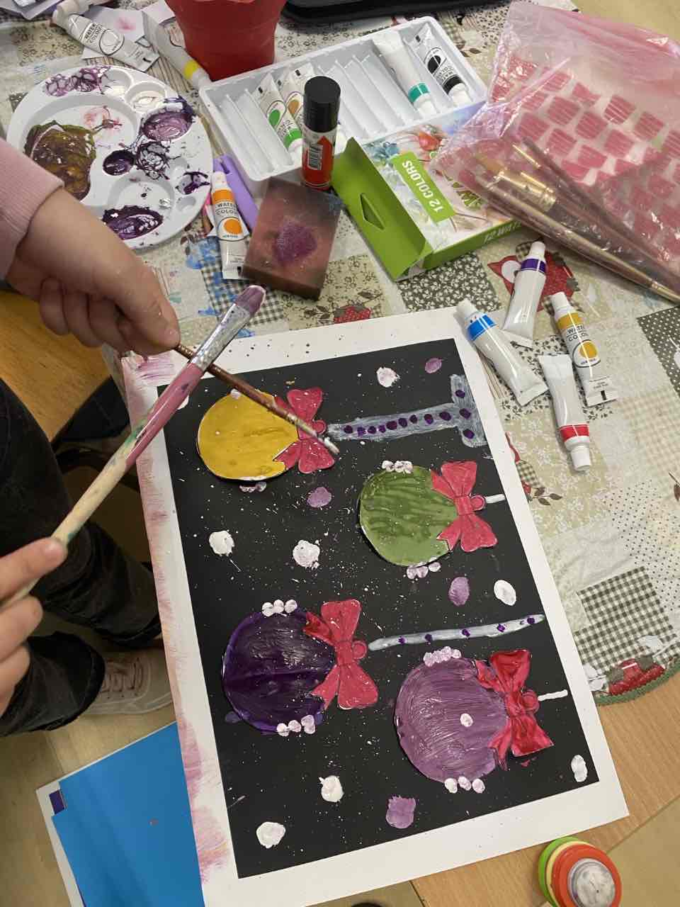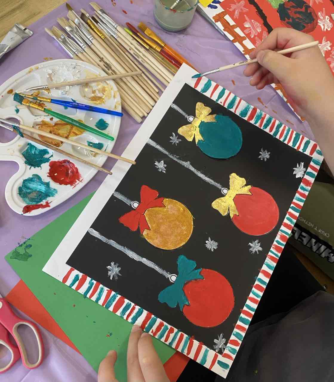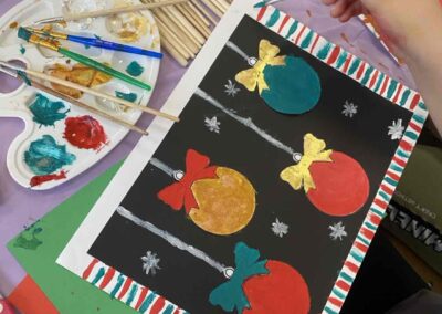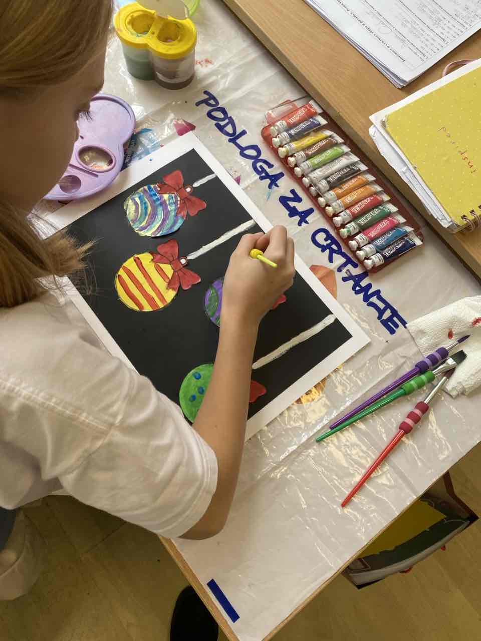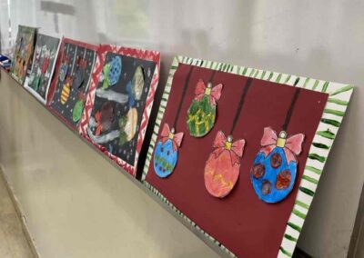 На секцији креативни кутак, ученици су се опробали у техници сликања акрилним бојама, инспирисани празничном атмосфером. Настали радови красе школски простор и преносе радост предстојећих празника. 🎄